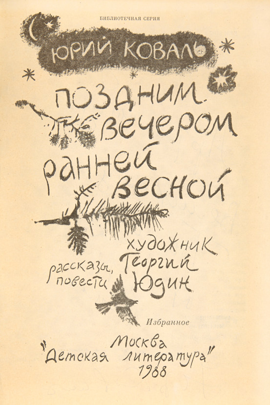 2. Коваль Ю. [Автограф] Поздним вечером ранней весной. М.: Детская литература, 1988. 493 [1] с. На авантитуле дарственная надпись автора Р. Варшамову. В издательском иллюстрированном переплете. Потертости переплета.