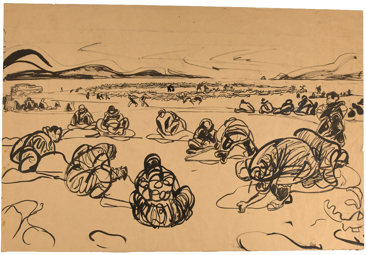 Чукотка. Забой оленей. Двусторонняя композиция. 1974 г. Кисть, тушь, 37×54,3 см.