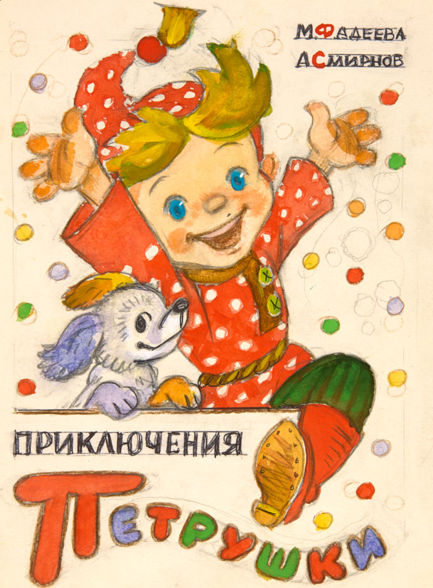 Оригинал обложки для «Приключения Петрушки» М. Фадеева. Бумага, карандаш, гуашь, 27×20,5 см.