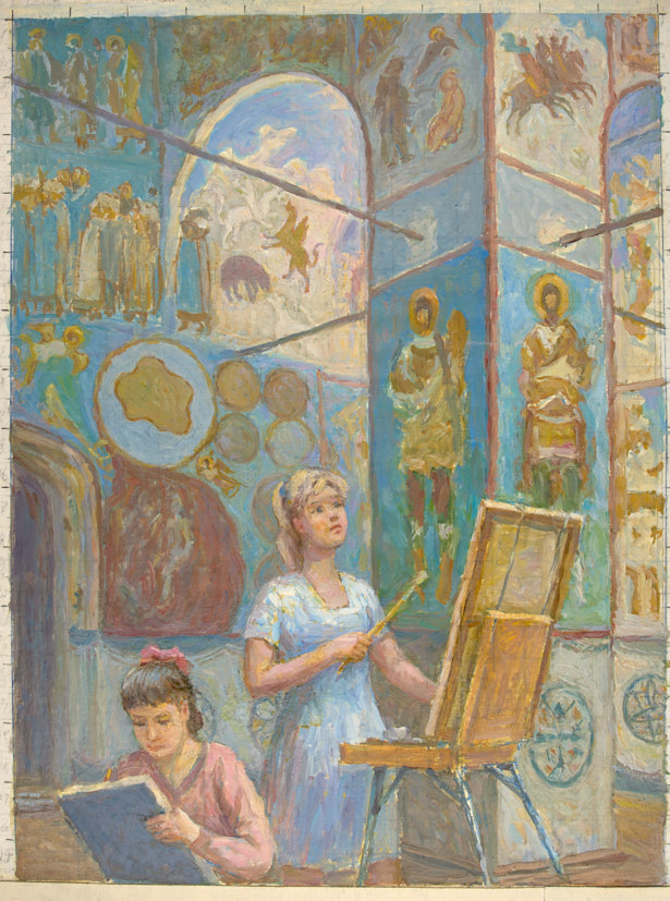 Художницы в храме. 1970-е гг. Картон, масло, 58,5×44,5 см.