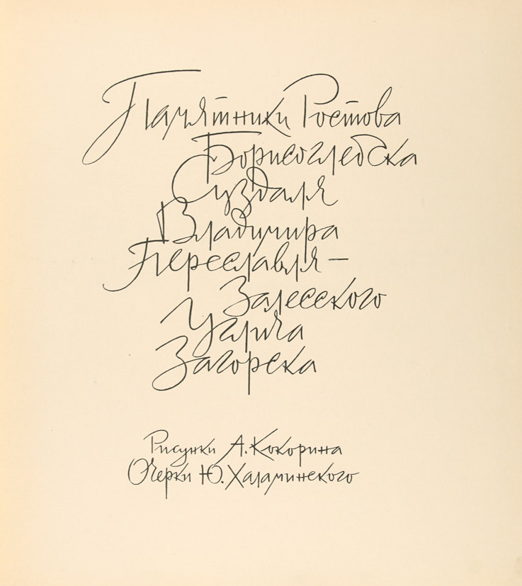 Памятники Ростова, Борисоглебска, Суздаля, Владимира, Переславля-Залесского, Углича, Загорска / А. В. Кокорин, Ю. Я. Халаминский ; Рис. А. Кокорина ; Очерки Ю. Халаминского. [М.]: [Сов. художник], [1962]. 123 с.: ил.