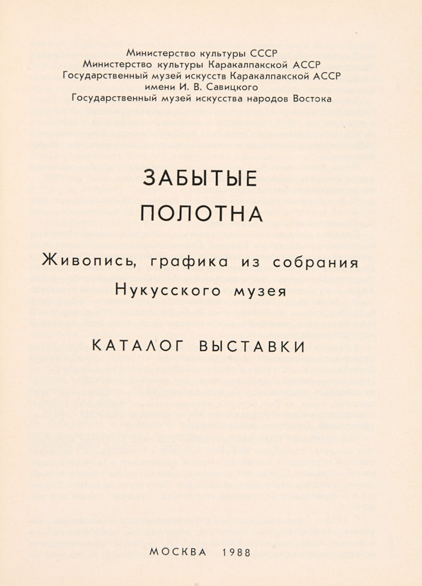 Забытые полотна. Живопись, графика из собрания Нукусского музея. каталог выставки. М: 1988. 51 с. ил.