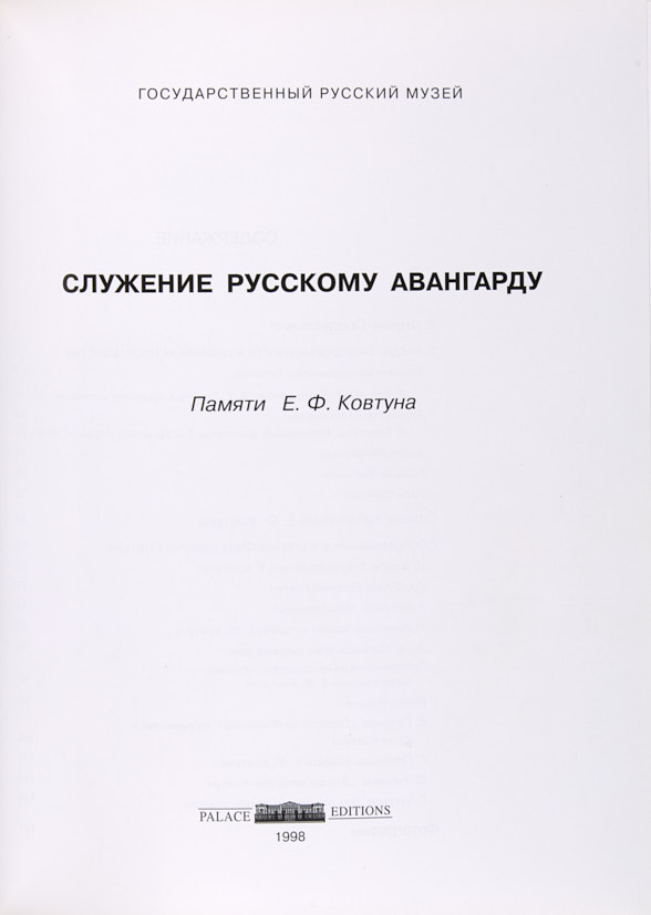 Служение русскому авангарду: Беспредметность в реальном пространстве. Татлин, Малевич, Матюшин: памяти Е. Ф. Ковтуна / Государственный русский музей ; автор статей, составитель подборки писем, документов, литературных материалов и каталога Е. Ф. Ковтун. СПб: Palace Editions, 1998. 128 с.
