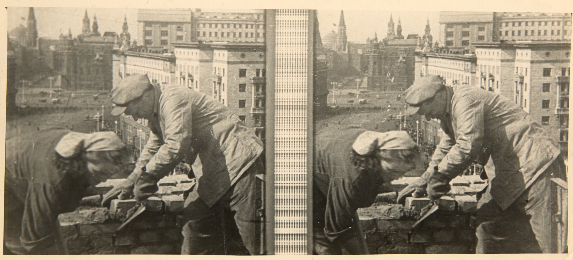 На строительстве гостиницы «Москва». 1930-е гг. Фотография, 11,5×24 см.
