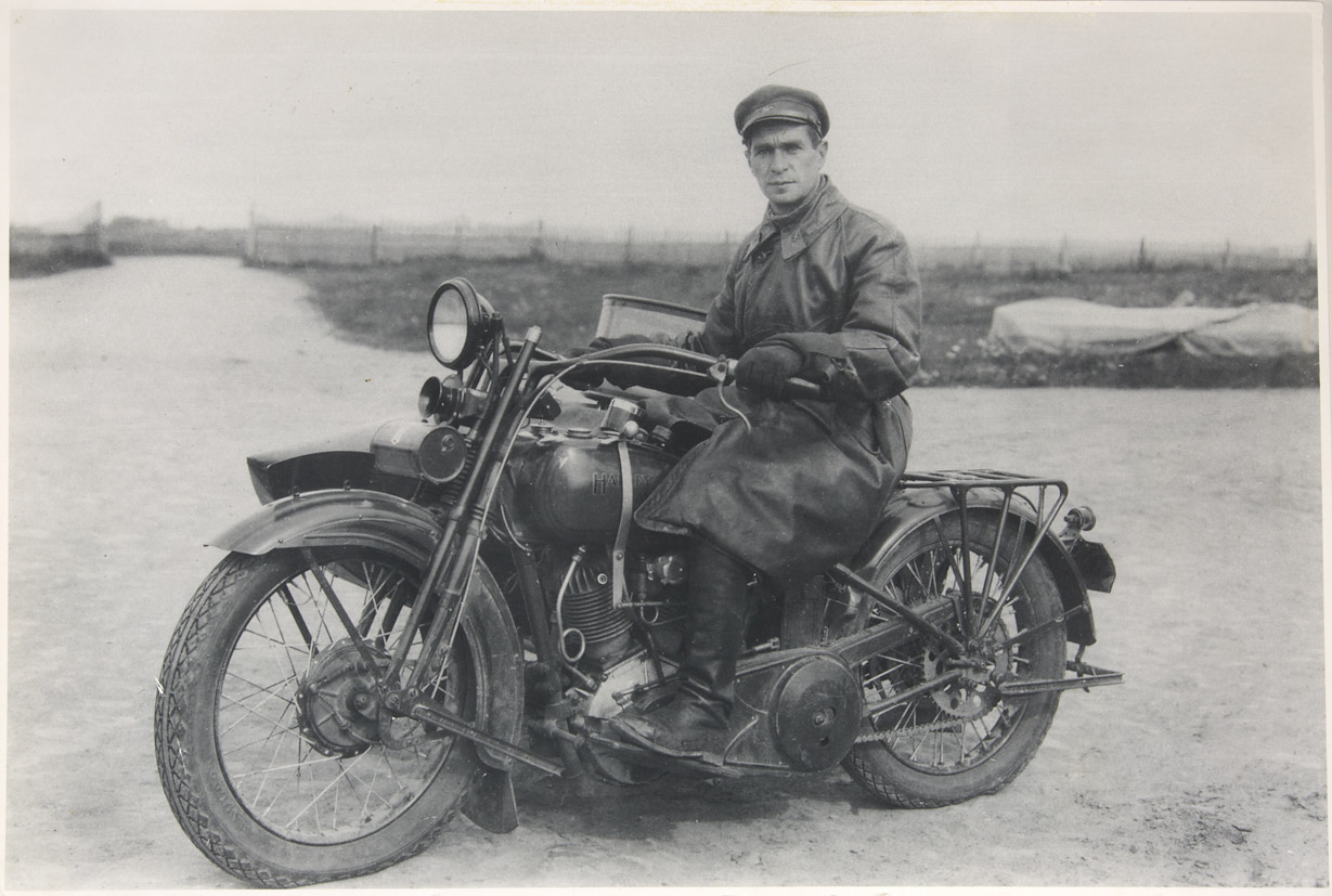 Генерал И. И. Копец на мотоцикле Харли Девидсон. Конец 1930-х гг. Отпечаток 1970-х гг. Фотография, 31×46 см.
