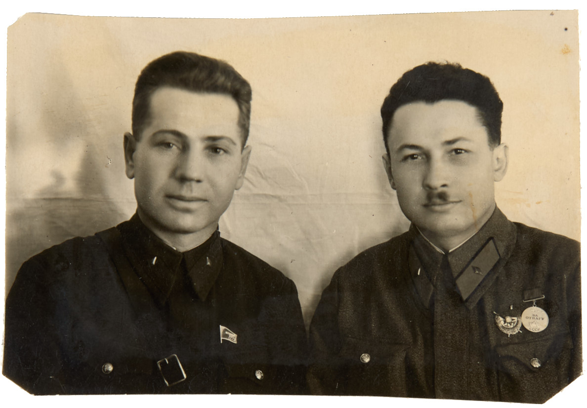Комдив З. Т. Сердюк с неизвестным комдивом с Орденом Красного знамени и медалью За отвагу. 1939-1940 гг. Фотография, ретушь, 7,5×11 см.