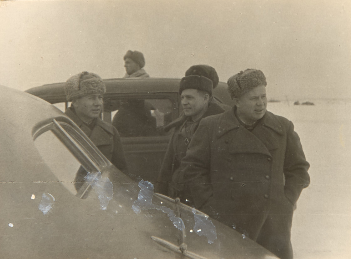 Лот из двух фотографий. Члены военсовета Сталинградского фронта Н. С. Хрущев, М. С. Шумилов, З. Т. Сердюк. Сталинград. 1942-1943 гг. 8,2×10,7; 7,2×8,7 см.