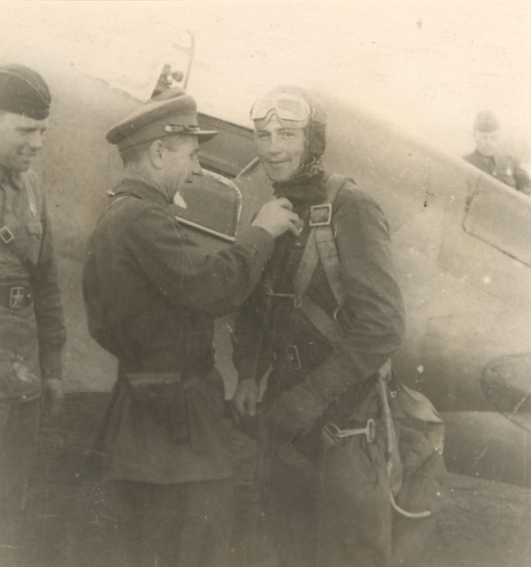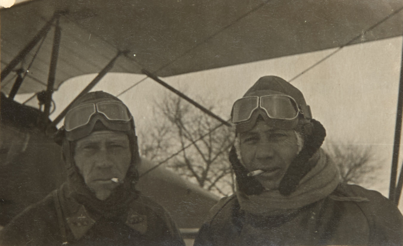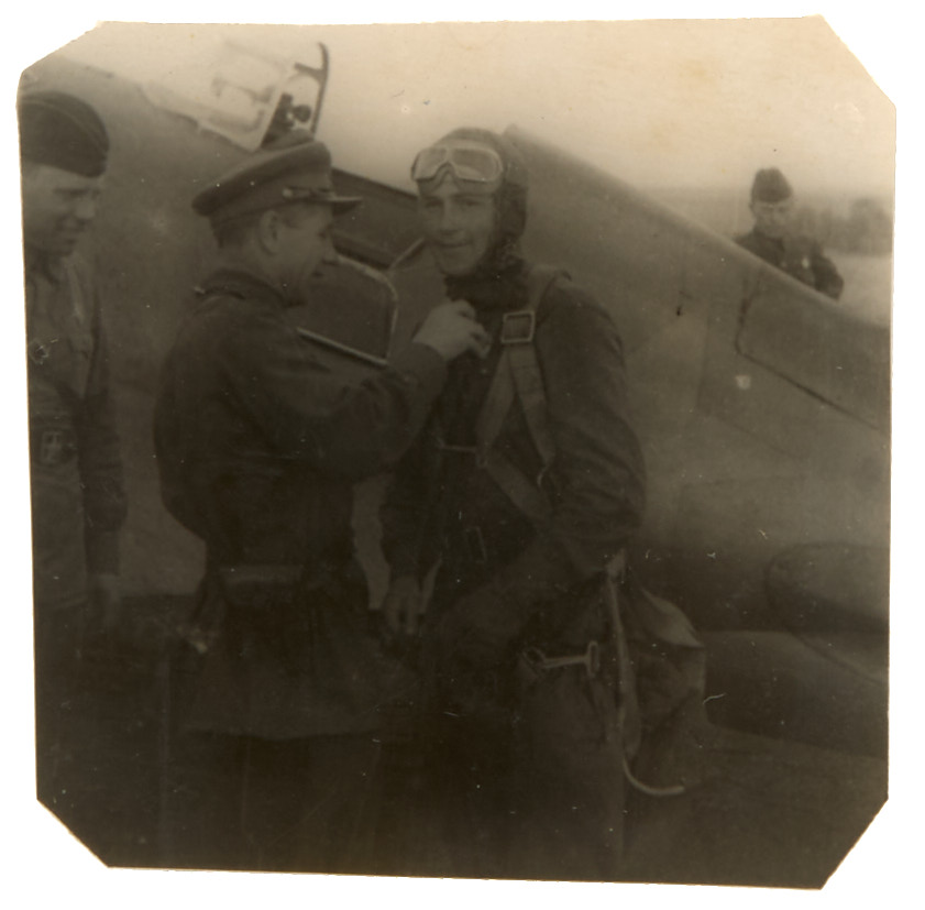 Лот из трех фотографий. Генерал З. Т. Сердюк [Автограф] и летчики боевой авиации на аэродроме. 1942 г. Фотографии, 5,2×8; 5,7×6; 6,2×5,7 см.