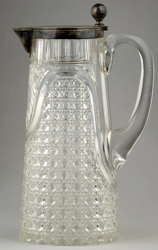 Графин для холодных напитков. Москва. 1890-е гг. Хрусталь, выдувание, гранение в стиле «Русский камень» и «Акант», шлифовка, серебро 84°, золочение, 27,3×11,2×8,4 см.