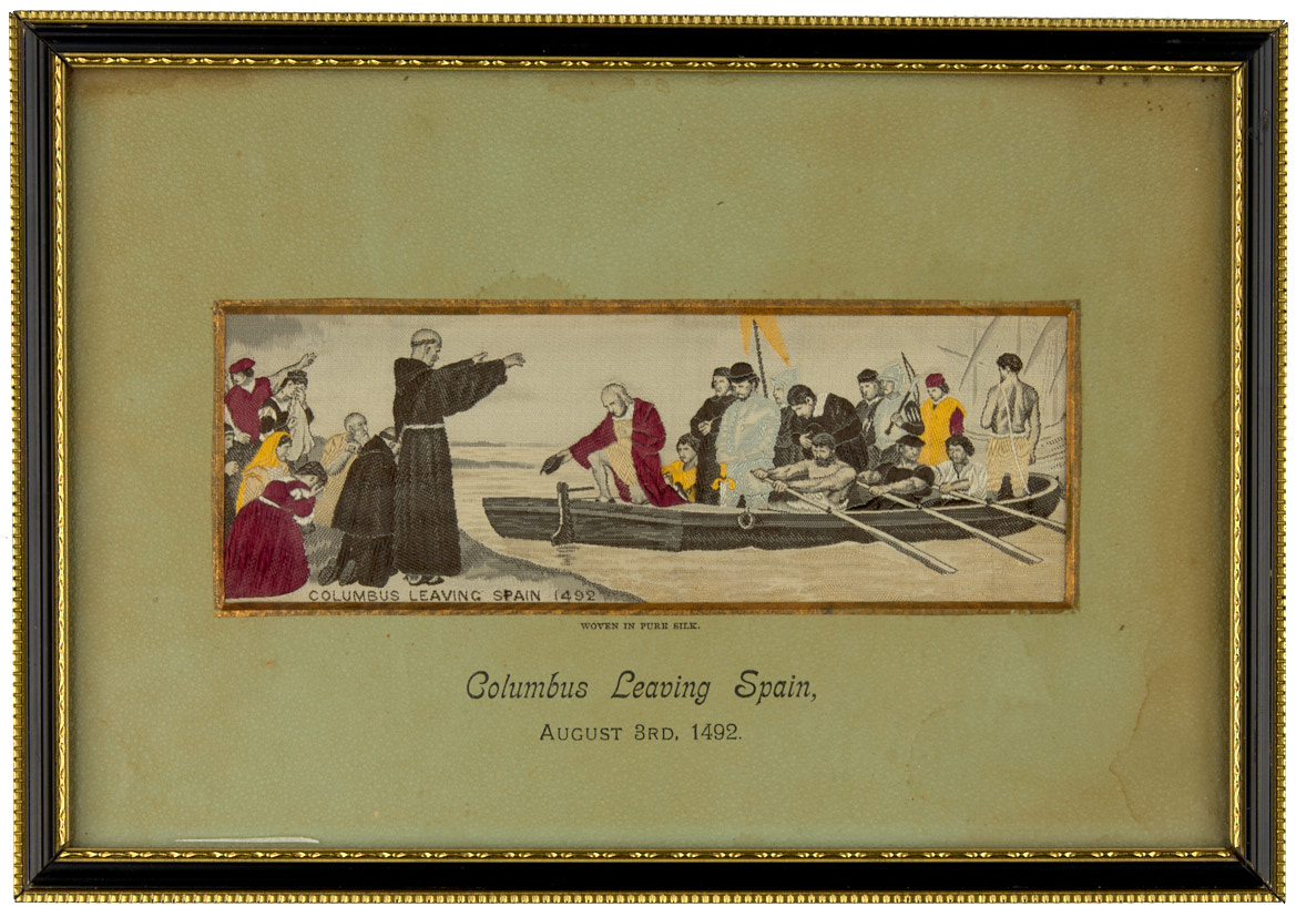 Викторианский тканый шелковый стивенграф. Отбытие Колумба из Испании в августе 3 августа 1492 г. 1890-е гг. Вышивка по шелку, 6,5×17,5 см. (в свету.)