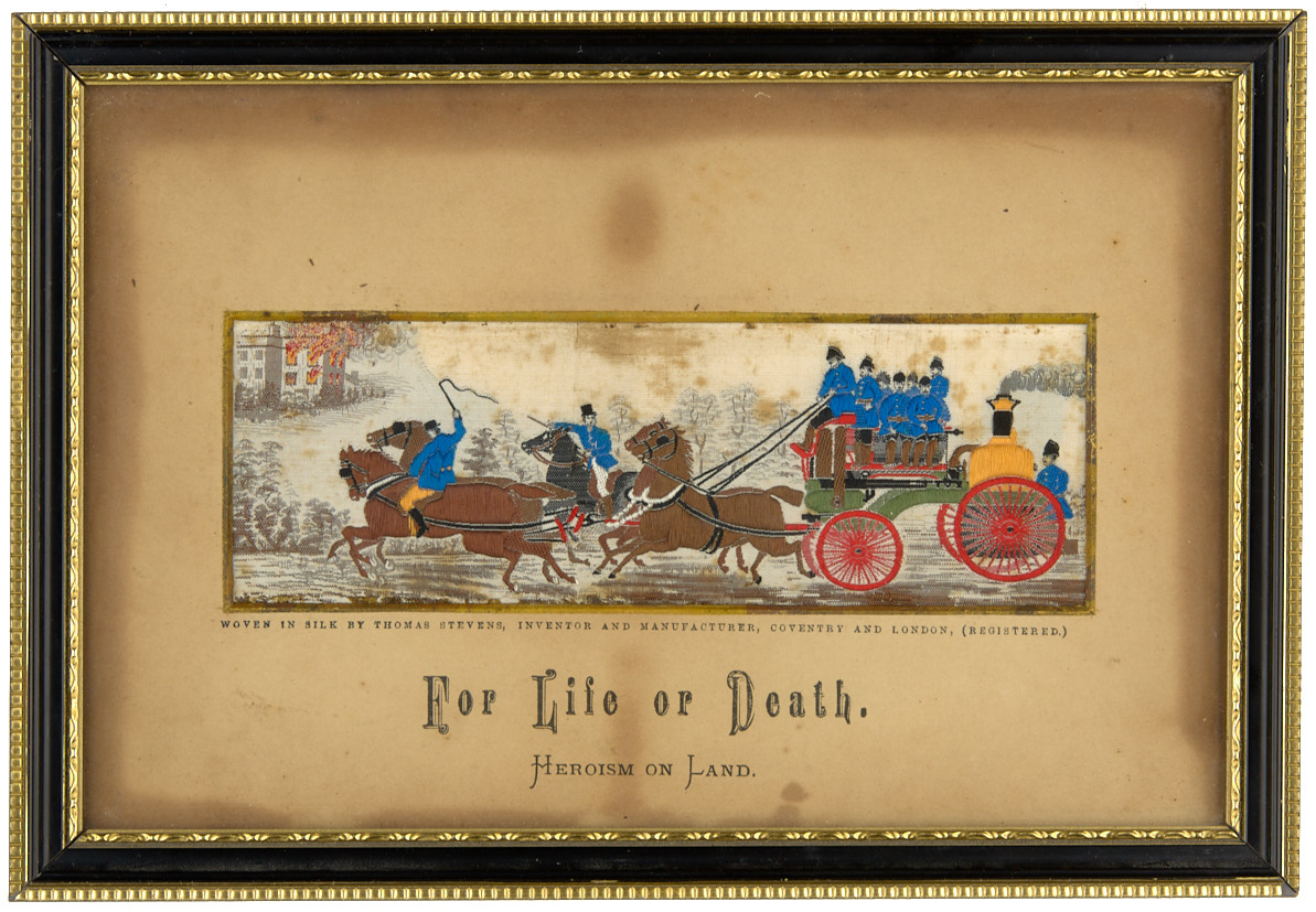 Викторианский тканый шелковый стивенграф. Выезд пожарной команды «Жизнь или смерть». 1890-е гг. Вышивка по шелку, 5,5×15,3 см. (в свету.)