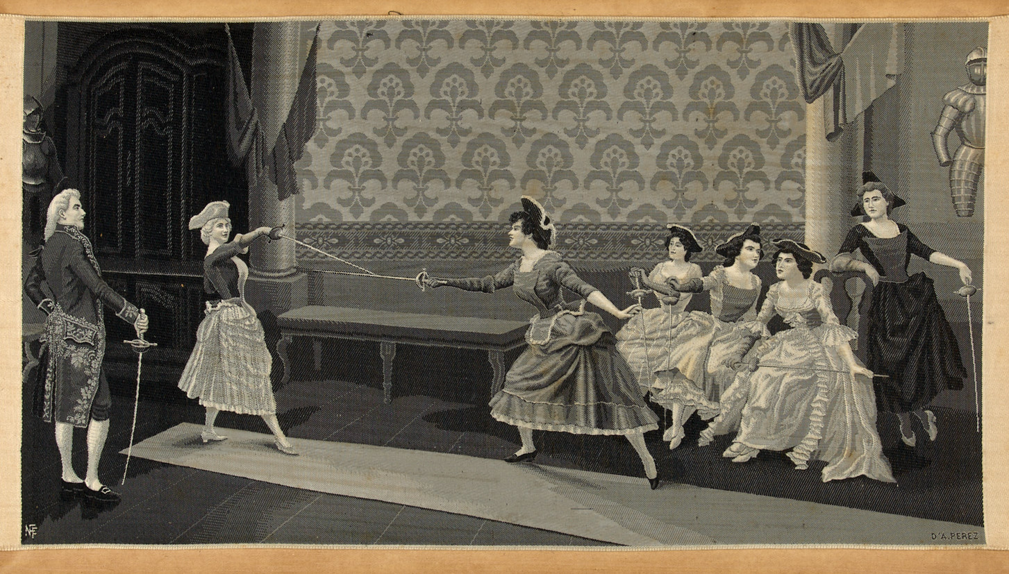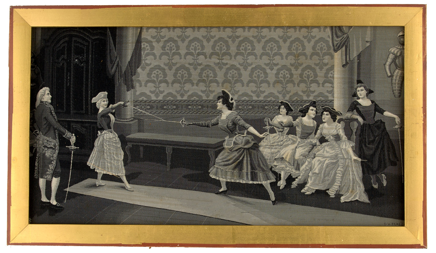 В фехтовальном зале. Сцена из эпохи Людовика XV. 1870-1880. Гобелен, шелк, смонтировано на лист картона, 20,5×36,6 см.
