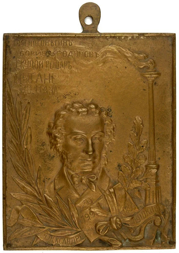 Памятная плакета к 100-летию со дня рождения А. С. Пушкина. 1899 г. Бронза, литье, чеканка, 19×15,5 см.