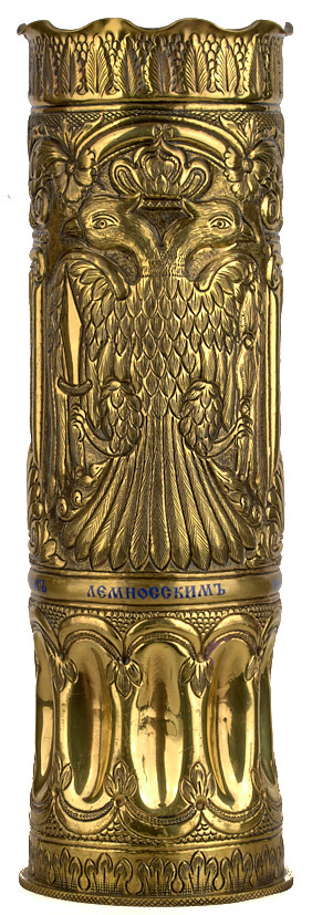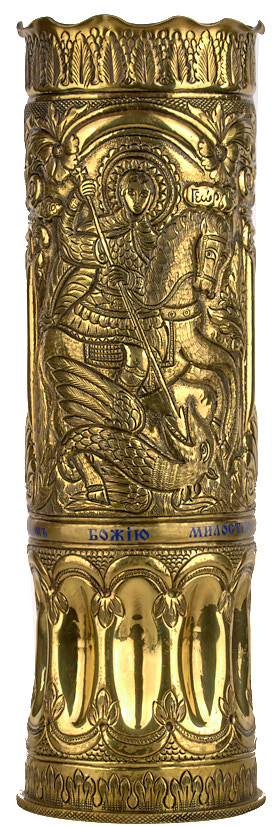 Центральная свеча для поликандила (подсвечника) памяти воинов - галиполийцев, изготовленная из гаубичного артиллерийского снаряда. 1920-е гг. Латунь, чеканка, эмаль, 36×11,3 см.