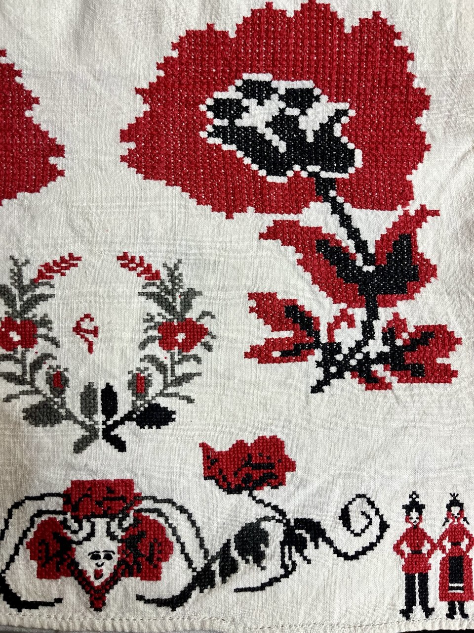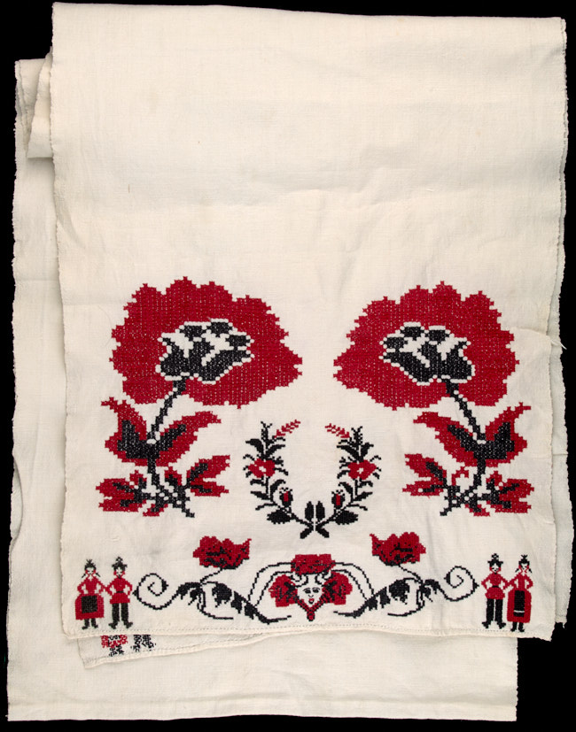 Рушник с вышивкой крестом. По краям вышивка, в центральном венке серп и молот. 1930-е гг. Холст, вышивка, 250×38 см.