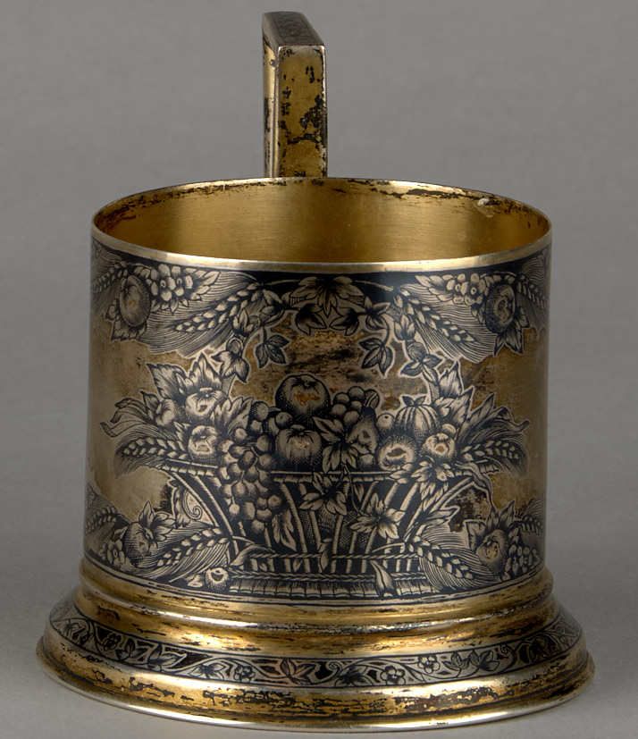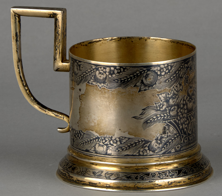 Подстаканник с символикой советского изобилия. Москва. 1930-е гг. Клейма Московской пробирной палаты с головой рабочего 875°. Белый металл, литье, чернение, золочение, 8,5×7 см. Вес 150 г.