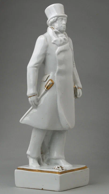 Марка синяя ЛФЗ. Модель датируется 1936 г. Поэт изображен в длинной бекеше в талию по моде 1830-х гг., в цилиндре, с тростью и книгой в руках. В основе замысла статуэтки лежит одноименный карандашный рисунок П.И. Челищева.