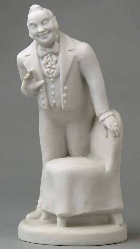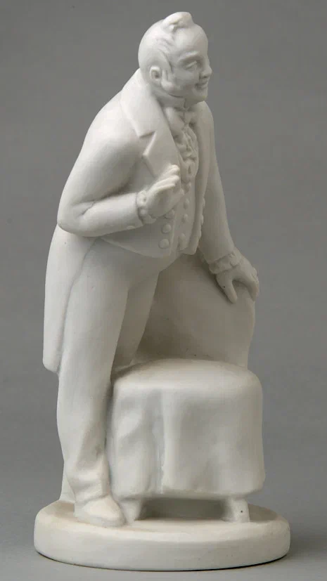Чичиков. Автор модели Б.Я. Воробьёв. СССР, ЛФЗ, 1950-е гг. Из серии скульптур к роману Н. В. Гоголя «Мертвые души». Фарфор, бисквит, 15,5×6,5 см.