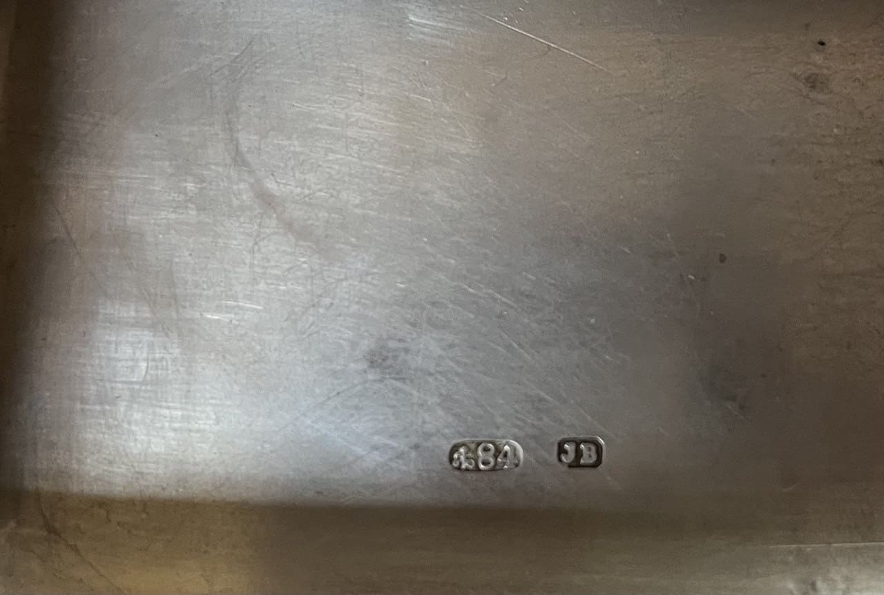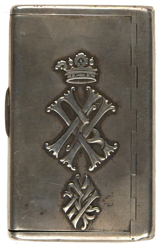 Жалованная табакерка. Петербург. 1870-е гг. Белый металл, литье, 11,5*7*2,2 см.