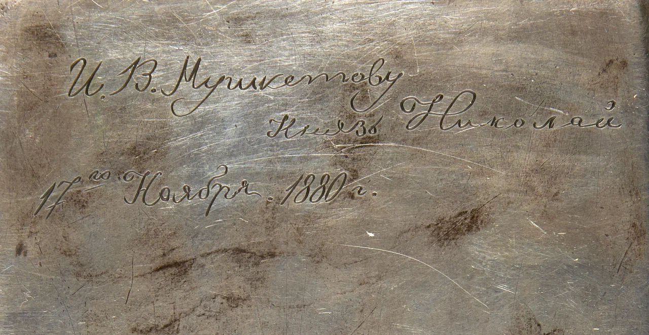 Клеймо Петербургской пробирной палаты и клеймо мастера Блейсбола Джона (мл.). Вес 255 г. На верхней крышке табакерки накладная монограмма великого князя Николая Константиновича под короной. На обороте табакерки гравированная дарственная надпись И. В. Мушкетову: Князь Николай. 17 ноября 1880 г.