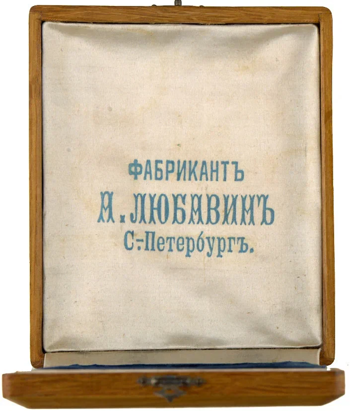 Клейма Московской пробирной палаты и мастера В. А. Вес 200 г. В историческом деревянном футляре фабриканта А. Любавина в Санкт-Петербурге, 14*12*2,5 см.