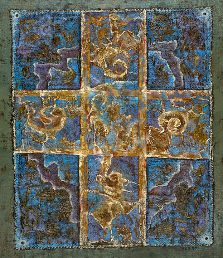 Окно. Композиция. 1997 г. Оргалит мешковина масло, коллаж, 70,5×60,5 см.