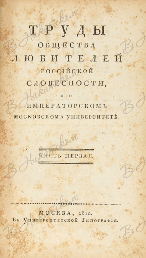 Труды Общества любителей российской словесности, при Императорском Московском университете. [В 25 ч.]. Ч. 1. М.: В Унив. тип., 1812.