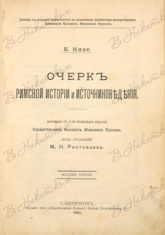 Низе, Б. Очерк римской истории и источниковедения / пер. с 3-го нем. изд. слушательниц Высших женских курсов под ред. М.И. Ростовцева. 2-е изд. СПб.: Общественная польза, 1908.