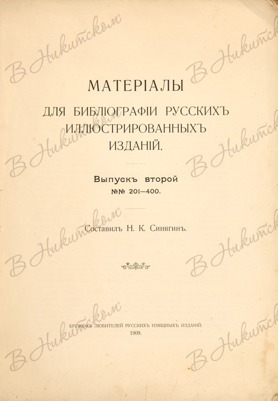 [Синягин, Н.К.]. Материалы для библиографии русских иллюстрированных изданий. Вып. 2. №№ 201-400 / Составил Н.К. Синягин. СПб.: Кружок Любителей Русских Изящных Изданий; Т-во Р. Голике и Р. Вильборг, 1909.