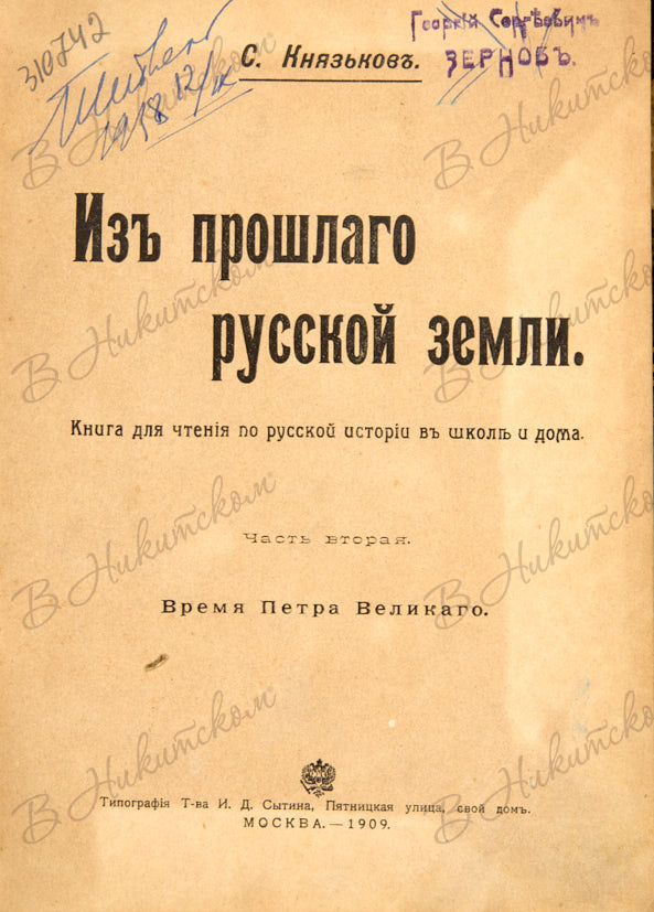 Князьков, С. Из прошлого русской земли. В 2 ч. Ч. 2. Время Петра Великого. М.: Тип. Т-ва И.Д. Сытина, 1909.