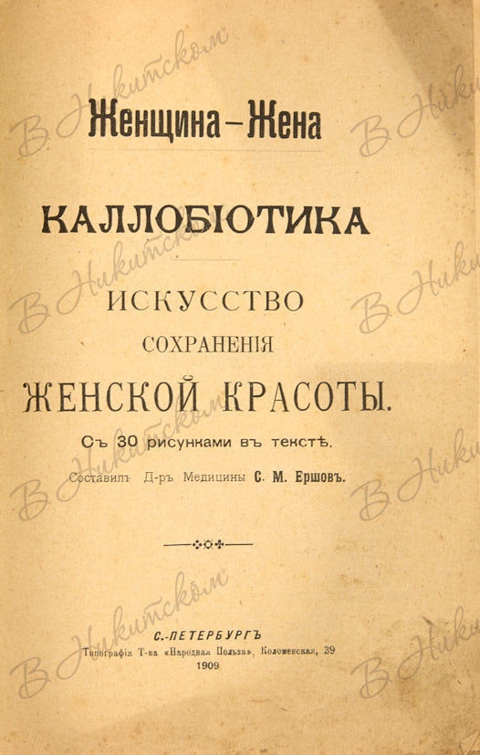 Ершов, С.М. Женщина-жена. Каллобиотика. Искусство сохранения женской красоты. СПб.: Тип. т-ва «Народная польза», 1909.