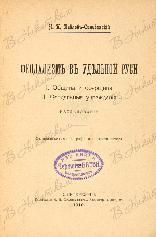 [Экземпляр революционера Ч. Баева]. Павлов-Сильванский, Н.П. Феодализм в удельной Руси. С приложением биографии и портрета автора. СПб.: Типография М.М. Стасюлевича, 1910.