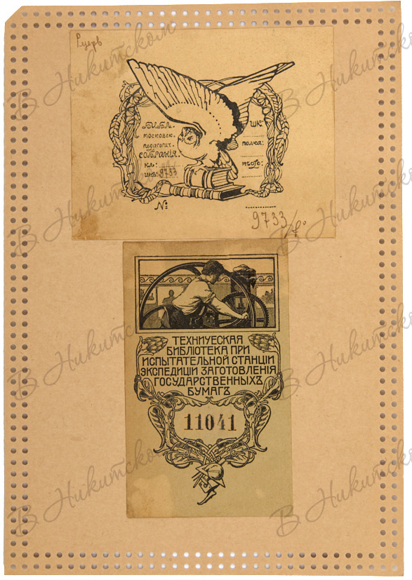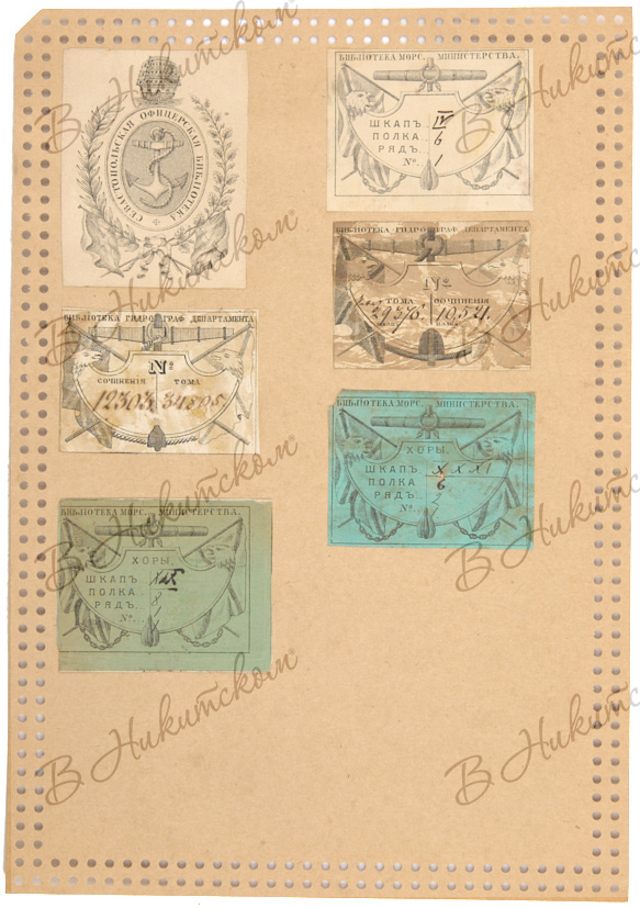 6 л. с экслибрисами. 29,7 х 20,8 см. Представлены экслибрисы: Морского министерства, Гидрографического департамента, Московского Общества Любителей Художеств, библиотеки Московского Купеческого Собрания и др.