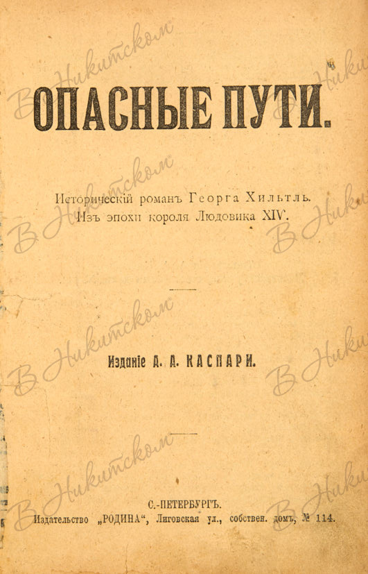 [Хильтль, Г.]. Опасные пути. Исторический роман Георга Хильтль. Из эпохи короля Людовика XIV / Издание А.А. Каспари. СПб.: Издательство «Родина», [1911].