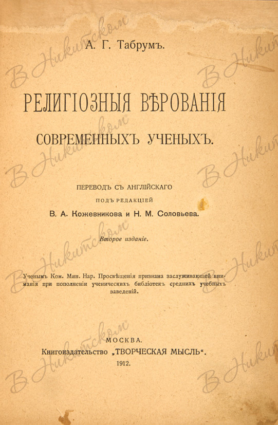 Табрум, А.Г. Религиозные верования современных учёных / перевод с англ. под ред. В.А, Кожевникова и Н.М. Соловьёва. М.: Книгоиздательство «Творческая мысль», 1912. 2-е издание.