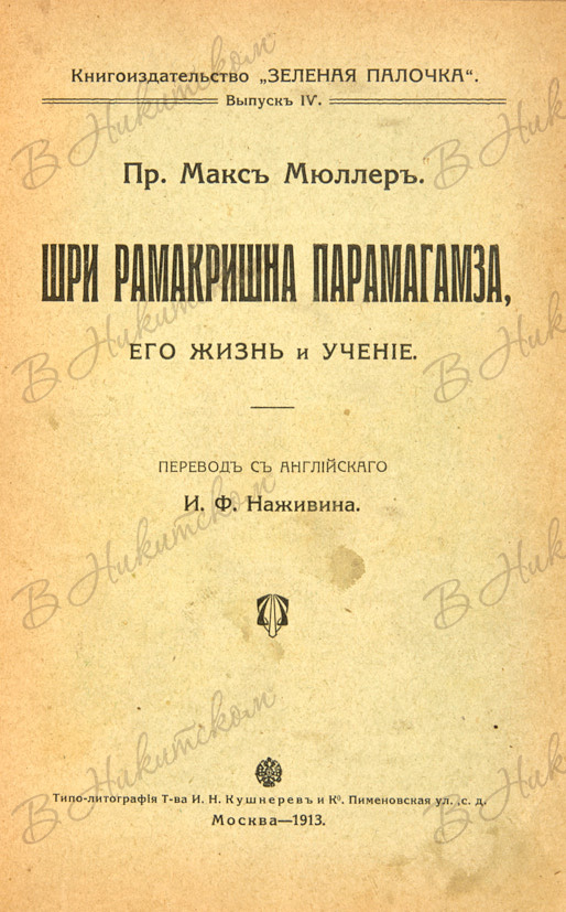 Мюллер, М. Шри Рама Кришна Парагамза, его жизнь и учение / перевод с англ. И.Ф. Наживина. М.: Типо-литография И.Н. Кушнерев и К°, 1913.