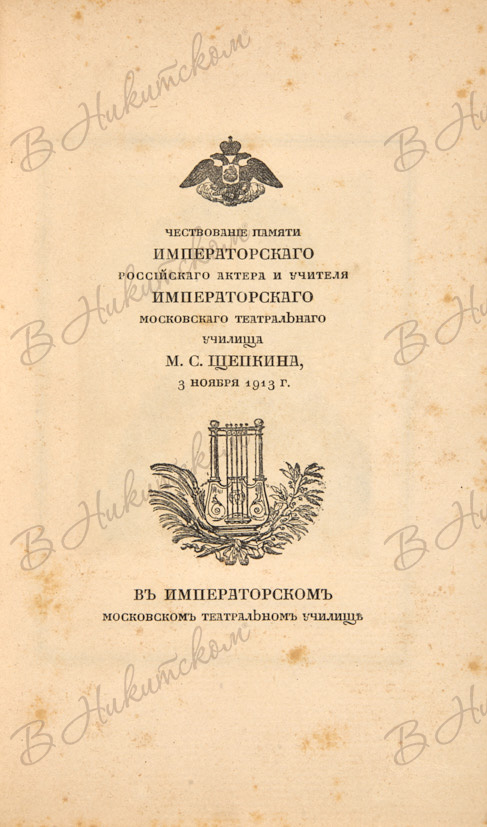 Чествование памяти Императорского российского актёра и учителя Императорского Московского Театрального Училища М.С. Щепкина, 3 ноября 1913 г. М.: В Императорском Московском Театральном Училище, 1913.
