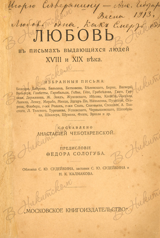 Чеботаревская А.Н. [Автограф И. Северянину]. Любовь в письмах выдающихся людей XVIII и XIX века. Избранные письма: Бодлэра, Байрона, Бальзака... [и др.] / сост. Анастасией Чеботаревской; предисл. Федора Сологуба. М.: Московское книгоиздательство, 1913.