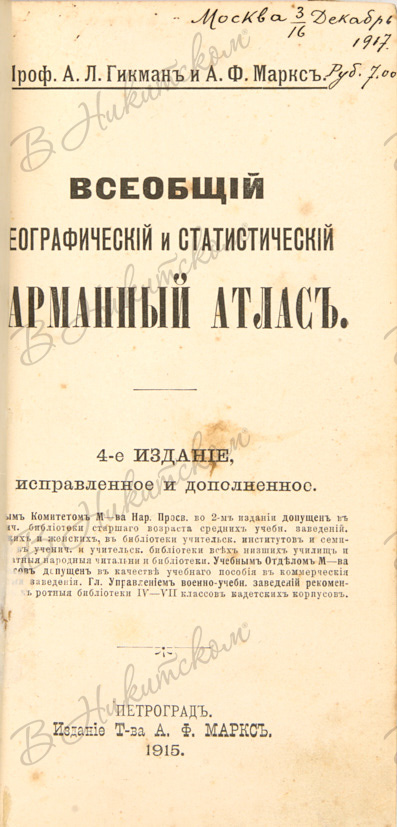 Проф. Гикман, А.Л. И Маркс А.Ф. Всеобщий географический и статистический карманный атлас. 4-е издание, исправл. и дополн. Пг.: Издание Т-ва А.Ф. Маркс, 1915.