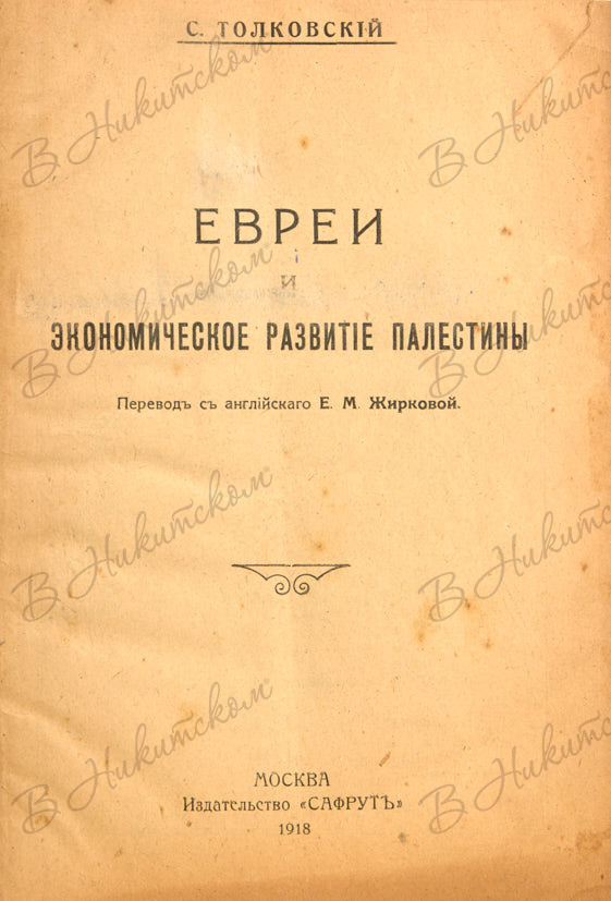 Толковский, С. Евреи и экономическое развитие Палестины / пер. с англ. Е.М. Жирковой. М.: Сафрут, 1918.