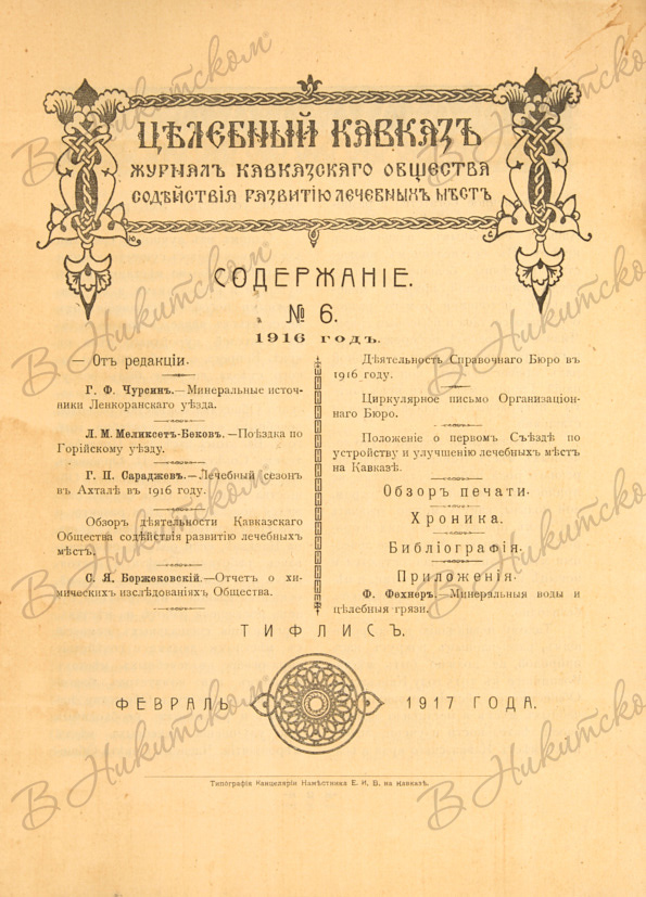 Целебный Кавказ. Журнал Кавказского Общества Содействия Развитию Лечебных Мест. № 6. Тифлис: Типография Канцелярии Наместника Е.И.В. на Кавказе, 1916.