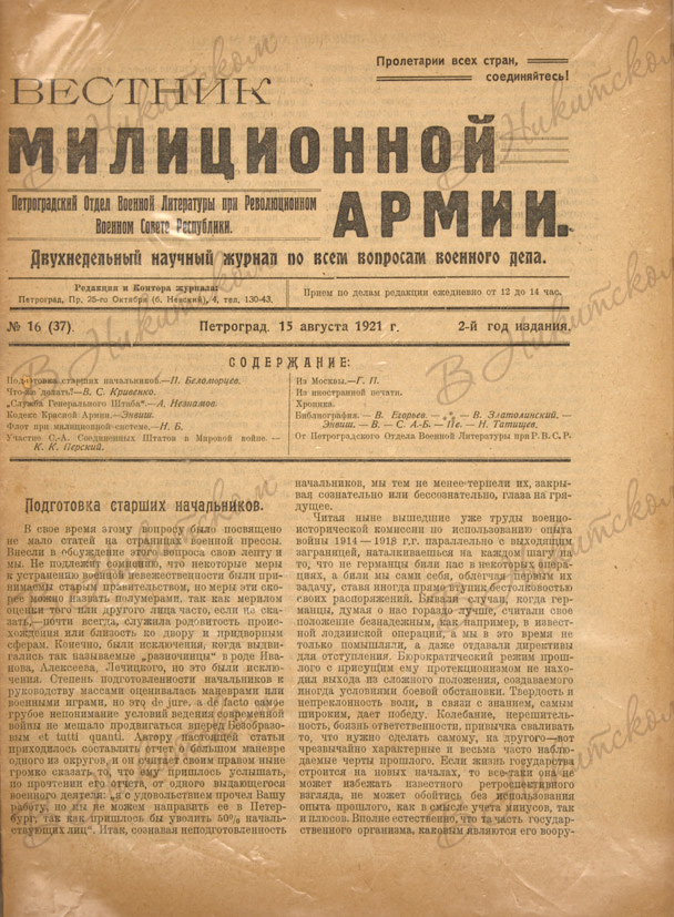 Вестник милиционной армии. Двухнедельный научный журнал по всем вопросам военного дела. 5 номеров за 1921 г. №№: 15(36); 14(35); 9-10(30-31); 16(37); 17(38). Пг.: Военная Типография Штаба РККА, 1921.