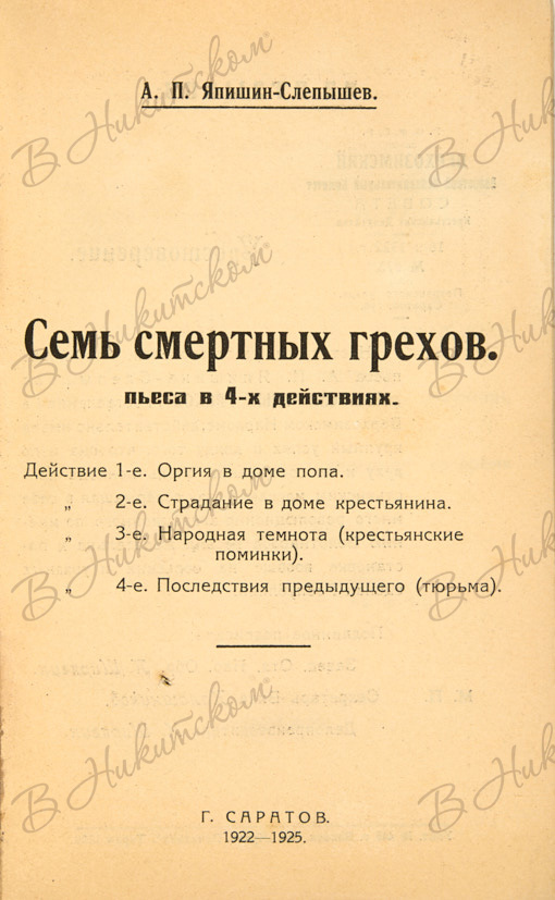 Япишин-Слепышев, А.П. Семь смертных грехов. Пьеса в 4-х действиях. Саратов: Тип. «Красный печатник», 1922-1925.