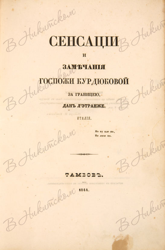 [Мятлев, И.П.] Сенсации и замечания госпожи Курдюковой за границею, дан Л’Этранже. В 3 т. Т. 1-3. Тамбов; [СПб.], 1840-1844.