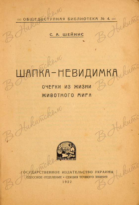 [Серия «Общедоступная библиотека»]. № 4. Шейнис, С.А. Шапка-невидимка. Очерки из жизни животного мира. Одесса: Всеукраинское государственное издательство, 1922.