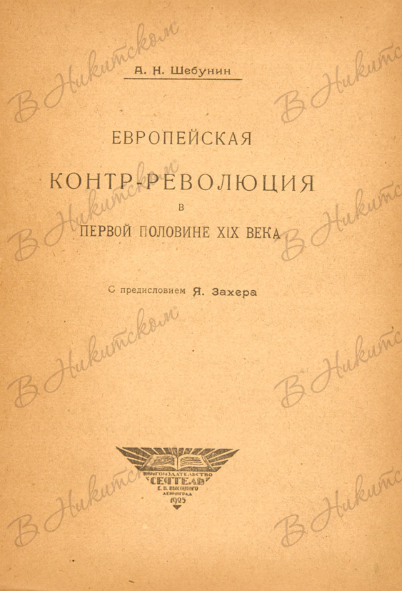 Шебунин, А.Н. Европейская контр-революция в первой половине XIX века / с пред. Я Захера. Л.: Книгоиздательство «Сеятель», 1925.