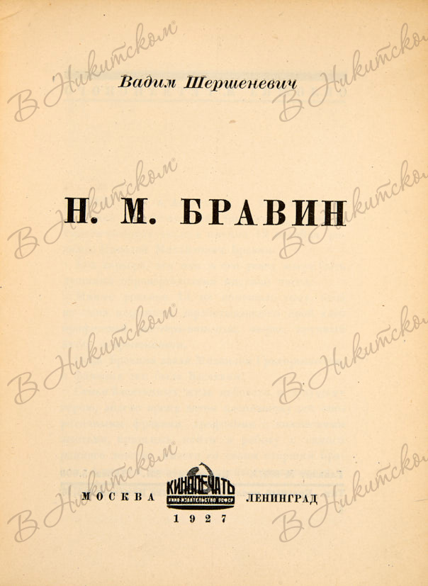 Шершеневич, В. Н. Бравин. М.; Л.: КИНОПЕЧАТЬ, 1927.