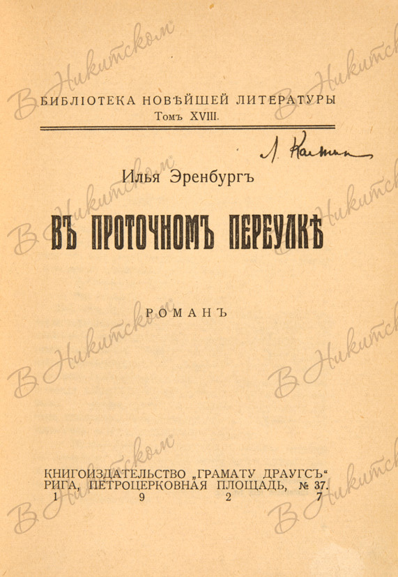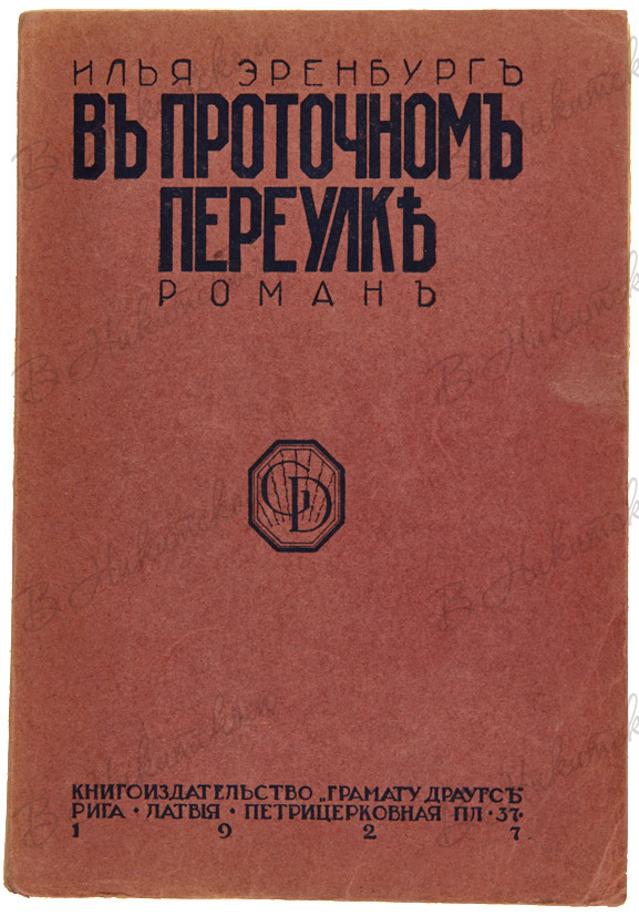 Эренбург, И.Г. В Проточном переулке. (Библиотека новейшей литературы; т. 18). Роман. Рига: Грамату Драугс, 1927.