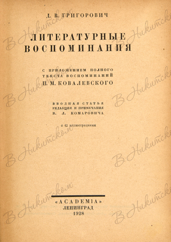 Григорович, Д.В. Литературные воспоминания / с приложением полного текста воспоминаний П.М. Ковалевского; вводная статья, редакция и примечания В.Л. Комаровича. Л.: Academia, 1928.