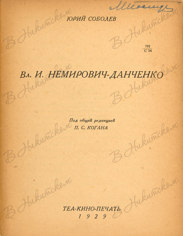 Соболев, Ю. Вл. И. Немирович-Данченко / под общей ред. П.С. Когана. М.: ТЕА-КИНО-ПЕЧАТЬ, 1929.